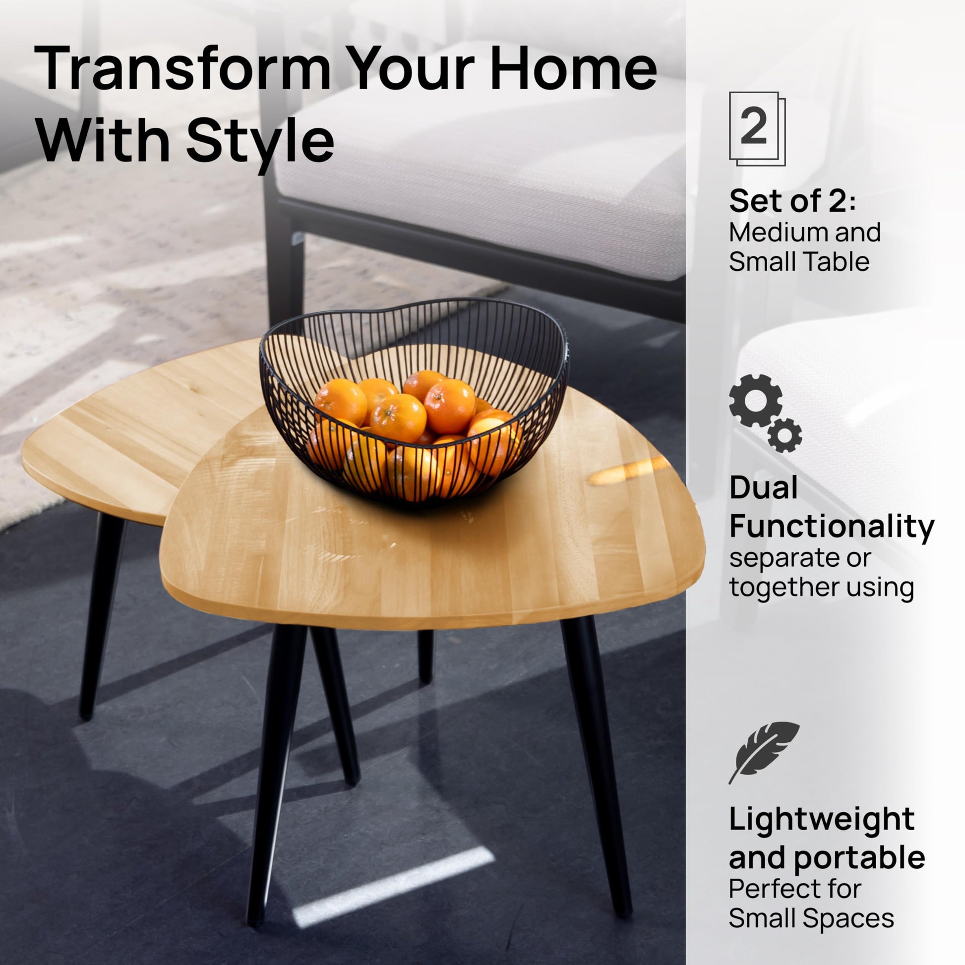 This set includes one large table (19.6" Γ 19.6") and one small table (14.9" Γ 14.9"), giving you the flexibility to stack, nest, or separate them to suit your space and layout preferences.